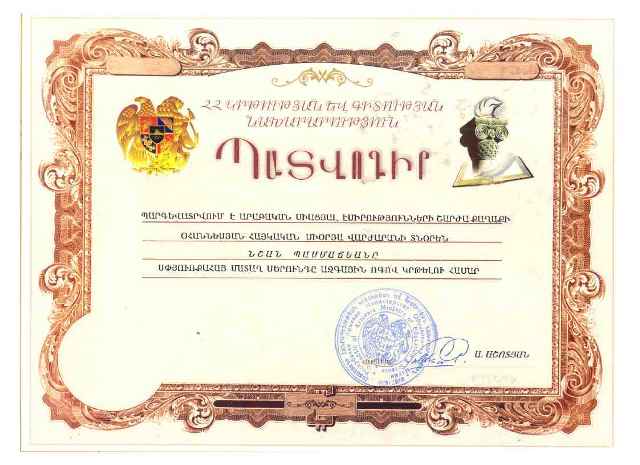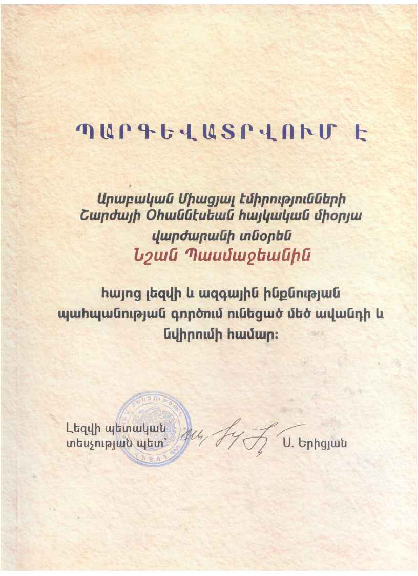 Principal of Ohannesian Weekly School in Sharjah Nishan Basmajian was granted two letters of honor by the Armenian Minister of Education and Science Armen Ashotyan and the Head of State Language Inspectorate Sergo Yeritsyan, respectively.